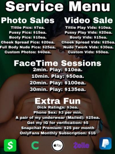 I have videos, pictures & I even offer 1 on 1 facetimes if your looking for some exclusive fun 😜🤫 Check Out My Menu Below. I'm ready for you now 😘 Absolutely No Meet Ups 🙅🏾